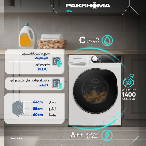 ماشین لباسشویی 9 کیلوگرم اتوماتیک پاکشوما مدل U‑9 یکی از مدلهای پیشرفته و خوشساخت این برند است که با بهرهگیری از فناوریهای مدرن، طراحی کاربردی و مصرف بهینه، گزینهای مناسب برای خانوادههای متوسط تا پرجمعیت بهحساب میآید. این دستگاه با بدنه آلومینیومی مقاوم تولید شده و طراحی درب از جلو با باز شدن به سمت چپ، استفاده روزمره را سادهتر میکند. ابعاد 80 سانتیمتر ارتفاع، 60 سانتیمتر پهنا و 60 سانتیمتر عمق باعث میشود محصول در اکثر فضای استاندارد کابینتها بهراحتی جا بگیرد. کنترل دستگاه از ترکیب دکمههای لمسی و سلکتور چرخشی انجام میشود و نمایشگر دیجیتال نیز وضعیت شستوشو، زمان باقیمانده و تنظیمات فعال را با وضوح مناسب نمایش میدهد. قلب اصلی این مدل، موتور BLDC است که نسبت به موتورهای تسمهای مصرف انرژی کمتری دارد، صدای کمتر تولید میکند و دوام بالاتری ارائه میدهد. میزان صدای 54 دسیبل نشان میدهد که دستگاه حتی هنگام شستوشو عملکردی کمصدا و آرام دارد. سرعت چرخش دیگ 1400 دور در دقیقه باعث میشود لباسها با رطوبت حداقلی از دستگاه خارج شوند و نیاز به خشککردن طولانی کاهش یابد. دیگ دستگاه از جنس استیل ضدزنگ و با طراحی الماسه ساخته شده که تماس ملایمتری با پارچه ایجاد میکند و از آسیبدیدن بافت لباس جلوگیری میکند. ظرفیت 9 کیلوگرمی آن نیز برای شستوشوی حجم بالایی از لباس در یک نوبت مناسب است. در بخش مصرف انرژی، این مدل با رده A++ عملکردی بهینه دارد و رده مصرف آب C بیانگر مصرف کنترلشده در مقایسه با ظرفیت بالای دستگاه است. وجود 16 برنامه اصلی شستوشو نیز انتخاب حالت مناسب را برای انواع پارچه و میزان آلودگی لباس آسان میکند. برنامههایی مانند شستوشوی سریع، شستوشوی خودکار و برنامه Drum Clean برای تمیزکردن داخلی دیگ از کاربردیترین این موارد هستند. امکانات ویژه دستگاه شامل شروع با تأخیر، خشککن داخلی، قابلیت اضافهکردن لباس در حین کار و تکنولوژی بخارشوی است که باعث افزایش کارایی و سهولت شستوشو میشود. همچنین وجود قفل کودک ایمنی دستگاه را برای خانوادههایی با کودک خردسال تضمین میکند. مجموعه این ویژگیها پاکشوما U‑9 را به یک گزینه کامل، کممصرف و مناسب برای استفاده روزمره تبدیل میکند.