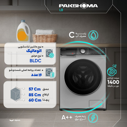 ماشین لباسشویی 8 کیلوگرم اتوماتیک پاکشوما مدل L8 یک انتخاب بهصرفه و مجهز برای خانوادههای متوسط است و با ظرفیت 8 کیلوگرم، نیازهای شستوشوی روزانه، لباسهای حجیم و انواع پارچههای حساس را بهخوبی پوشش میدهد. موتور BLDC با عملکرد آرام و صدای 54 دسیبل، مصرف انرژی کمصداتر و پایدار را فراهم میکند و با رده انرژی A++ و رده مصرف آب C تعادل مناسبی میان کارایی و مصرف ایجاد شده است. سرعت چرخش 1400 دور در دقیقه نیز باعث آبگیری مؤثرتر شده و زمان خشکشدن لباسها را کاهش میدهد. طراحی درب از جلو، بدنه آلومینیومی و دیگ استیل ضدزنگ الماسه از نظر دوام و محافظت از الیاف، عملکردی قابل اتکا ارائه میدهد. در بخش برنامهها، ماشین لباسشویی 8 کیلوگرم اتوماتیک پاکشوما مدل L8 از 16 برنامه اصلی شستوشو و مجموعهای گسترده از آپشنهای تکمیلی برخوردار است. وجود برنامههایی مانند شستوشوی سریع 15 دقیقهای، شستوشوی خودکار، Drum Clean، شستوشوی کودک، شستوشوی اقتصادی، برنامه لباسهای ورزشی، لباسهای رنگی، MIX و BULKY امکان شستوشوی هوشمند و دقیق را برای هر نوع پارچه فراهم میسازد. تکنولوژی بخارشوی و قابلیت ضدآلرژی با کاهش چروک و از بینبردن آلودگیهای عمقی، کیفیت شستوشو را یک سطح بالاتر میبرد. امکاناتی مانند اضافهکردن لباس در حین کار، شروع با تأخیر، تنظیم دمای آب، تعیین سطح آب و تنظیم سرعت خشککن، انعطافپذیری و کنترل بیشتری به کاربر میدهد. وجود سنسور وزن نیز مصرف آب و زمان شستوشو را متناسب با حجم لباسها تنظیم میکند. در بخش طراحی و کاربری، ماشین لباسشویی 8 کیلوگرم اتوماتیک پاکشوما مدل L8 با نمایشگر دیجیتال، کنترل ترکیبی لمسی و چرخشی و ابعاد 85 × 60 × 57 سانتیمتر بهگونهای طراحی شده که هم استفاده از آن آسان باشد و هم در فضای استاندارد آشپزخانه بهخوبی جای بگیرد. این مدل با قابلیتهای متنوع، مصرف انرژی مناسب و عملکرد کمصدا، گزینهای جذاب برای خانوادههایی است که به امکانات مدرن و شستوشوی دقیق نیاز دارند.